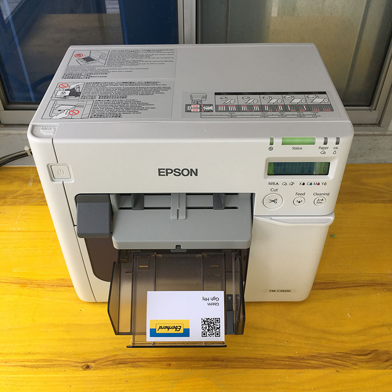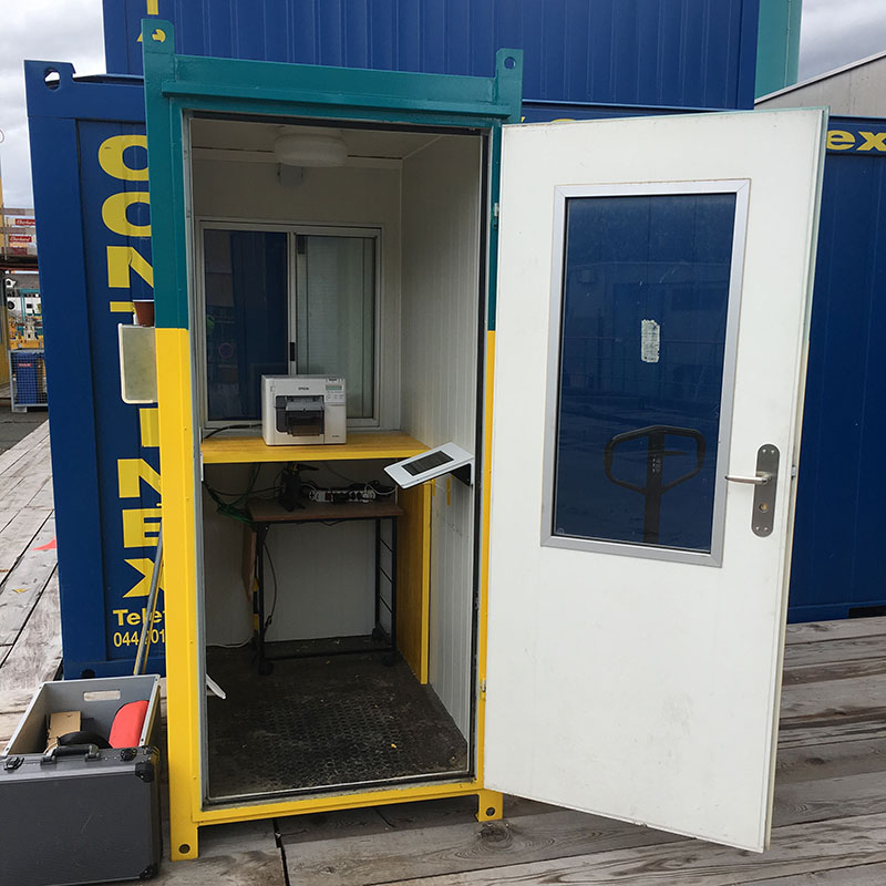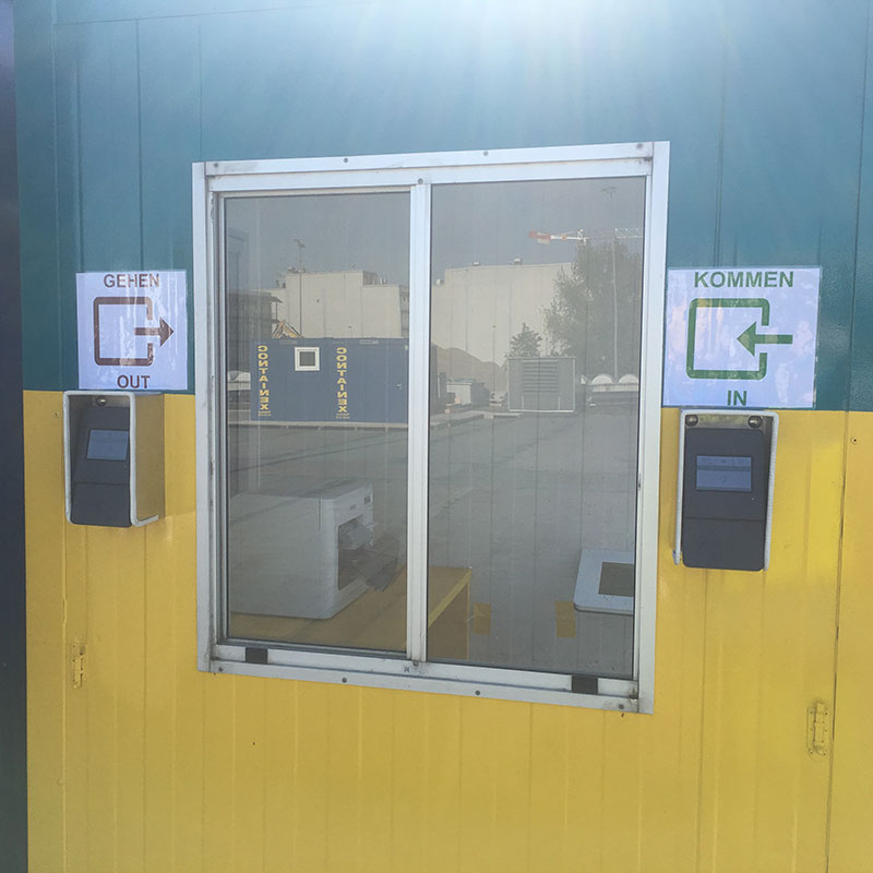 Zur kontaktlosen Selbstregistrierung wird ein EPSON ColorWorks C3500, der in einem Baucontainer steht, eingesetzt um die Baustellenausweise mit einem QR-Code zu versehen.