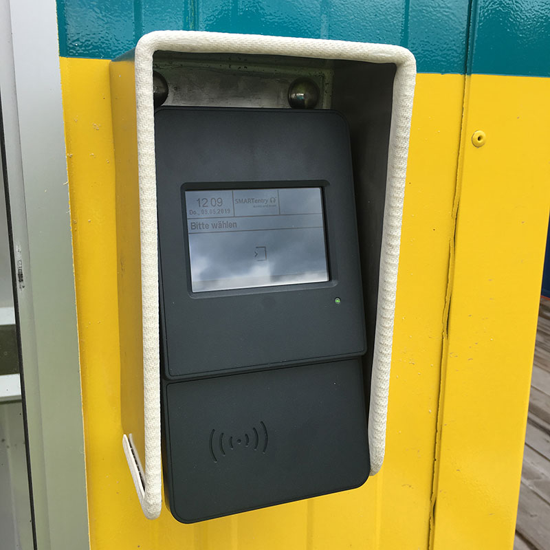 Für Baustellen lieferte Heyden-Securit die perfekte Lösung um eine kontaktlose Selbstregistrierung und einen reibungslosen Check-In zu gewährleisten. Mit der Softwarelösung SMARTentry können sich Baustellenmitarbeiter und Besucher eigenständig an einem Terminal registrieren. Danach können sie sich an den außen angebrachten Check-In und Check-Out Datafox Terminals an einem Container mit einem QR Code anmelden.