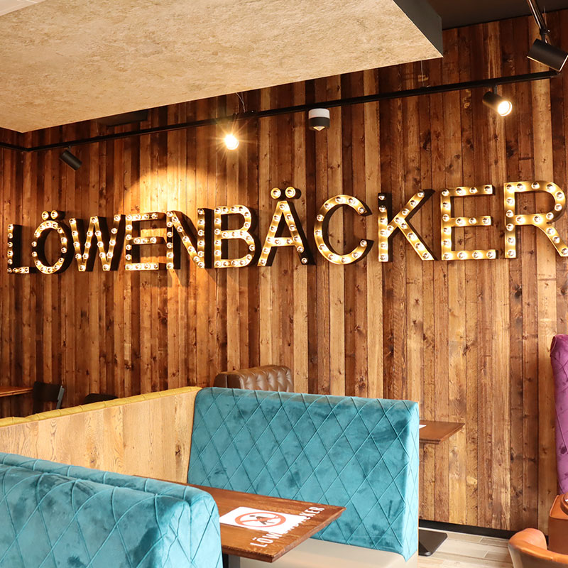 Das ofenfrische Löwenbäcker-Café hat einladende Räumlichkeiten – moderne Holzoptiken, bunte, aber stilvolle Polster, innovative Möbel, eine ansprechende Verkaufstheke – kurz gesagt: sehr viel Liebe zum Detail. Das Fensterdisplay ist die ideale Lösung für Installationen hinter Schaufenstern oder an Standorten mit hellem Umgebungslicht.