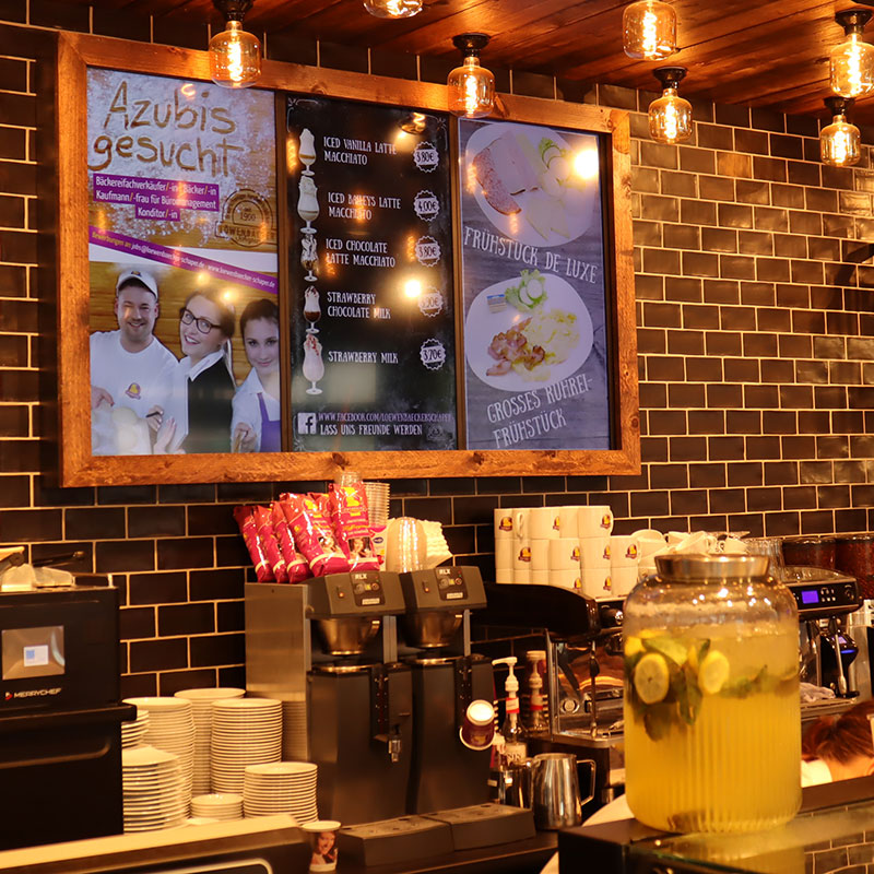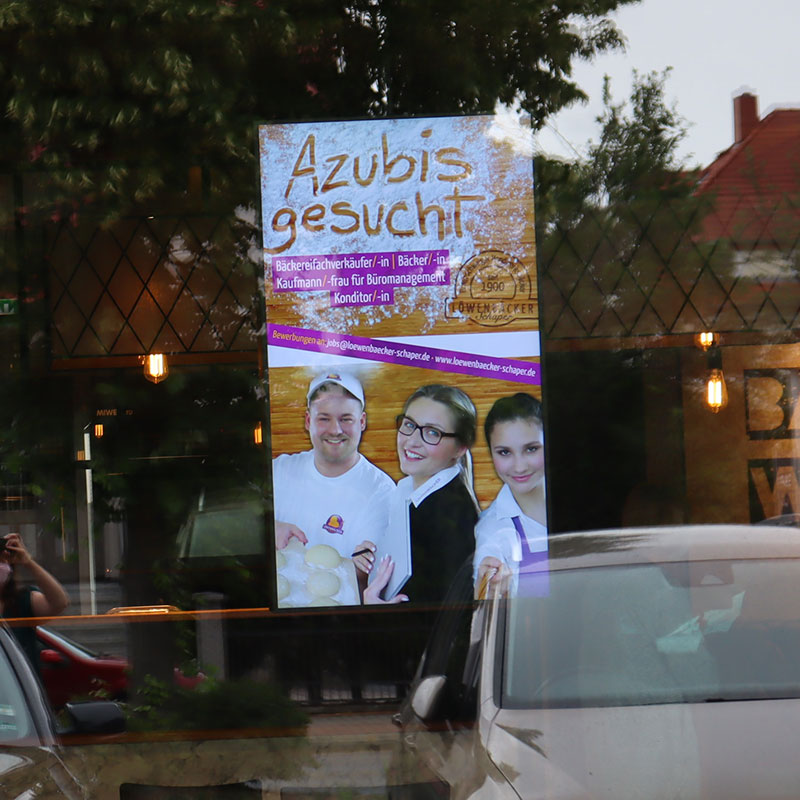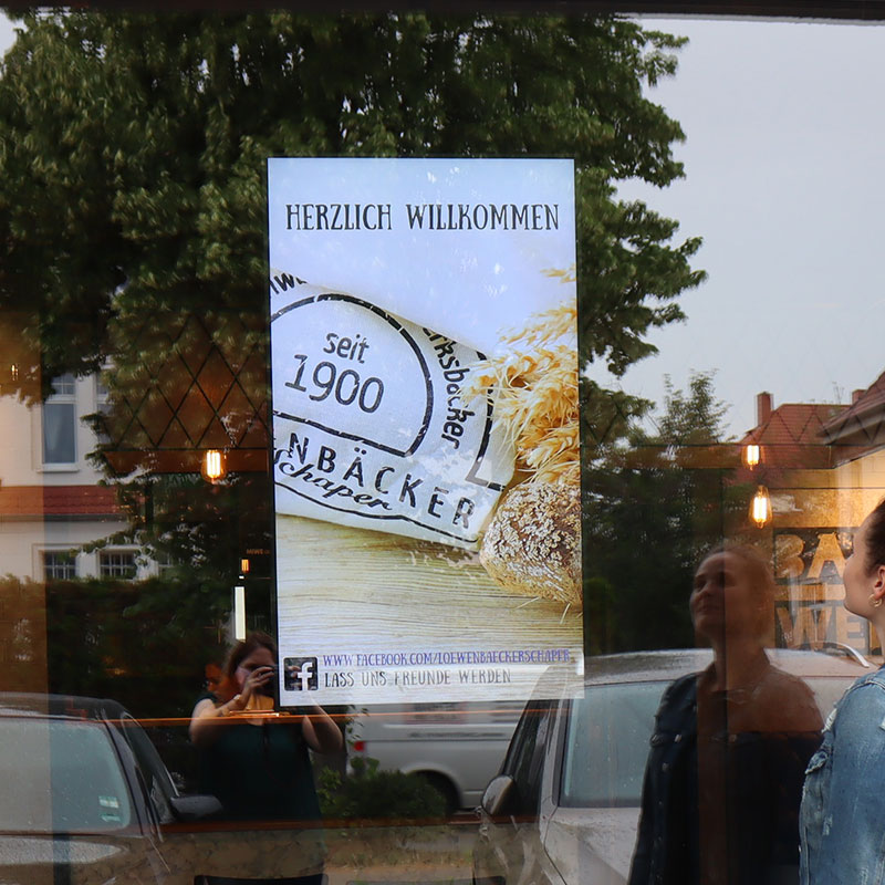 Der Löwenbäcker Schaper e.K. ist ein Braunschweiger Familienbetrieb seit über 100 Jahren! Insgesamt gibt es 38 Fachgeschäfte rund um Braunschweig. Eine neue Filiale wurde im Dezember 2019 eröffnet und liegt an einer gut befahrenen Straße. Mit dem innenliegenden Fensterdisplay mit einer besonderen Helligkeit von 2.500 cd/m² ist es perfekt für die vorbeifahrenden Autos zu sehen.