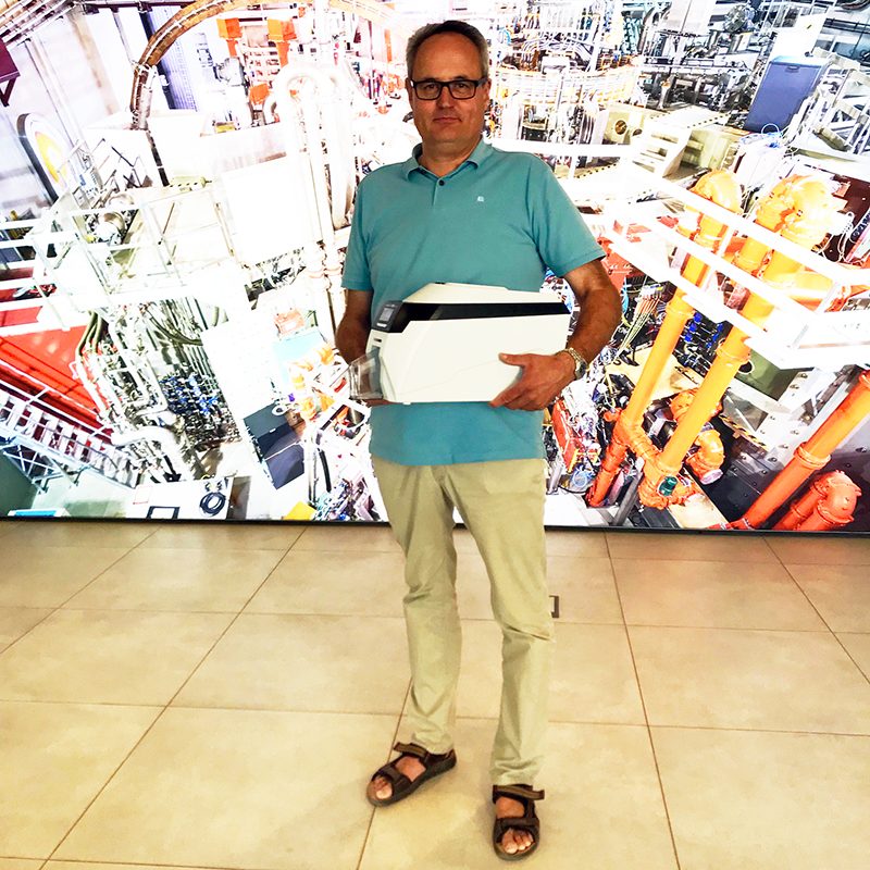 Am 22.08.2018 konnte der langjährige Mitarbeiter der Heyden-Securit GmbH Ralf Duesmann dem glücklichen Gewinner Stefan Bergmayer, Stabsabteilung ‚Zentrale Sicherheit’, am Max-Planck-Institut für Plasmaphysik in Garching bei München einen nagelneuen Magicard Rio Pro 360 Duo überreichen, den dieser auf der Sicherheitsexpo 2018 in München gewonnen hat.